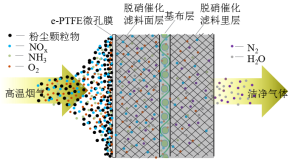 元琛科技的霄氟綠?除塵脫硝一體化濾料是在除塵過濾材料的基礎上生長、填隙、添加SCR脫硝催化劑,使其不僅具有過濾粉塵顆粒物的功能,還具有脫硝催化功能,即同時具備脫除顆粒物和NOx的功能。